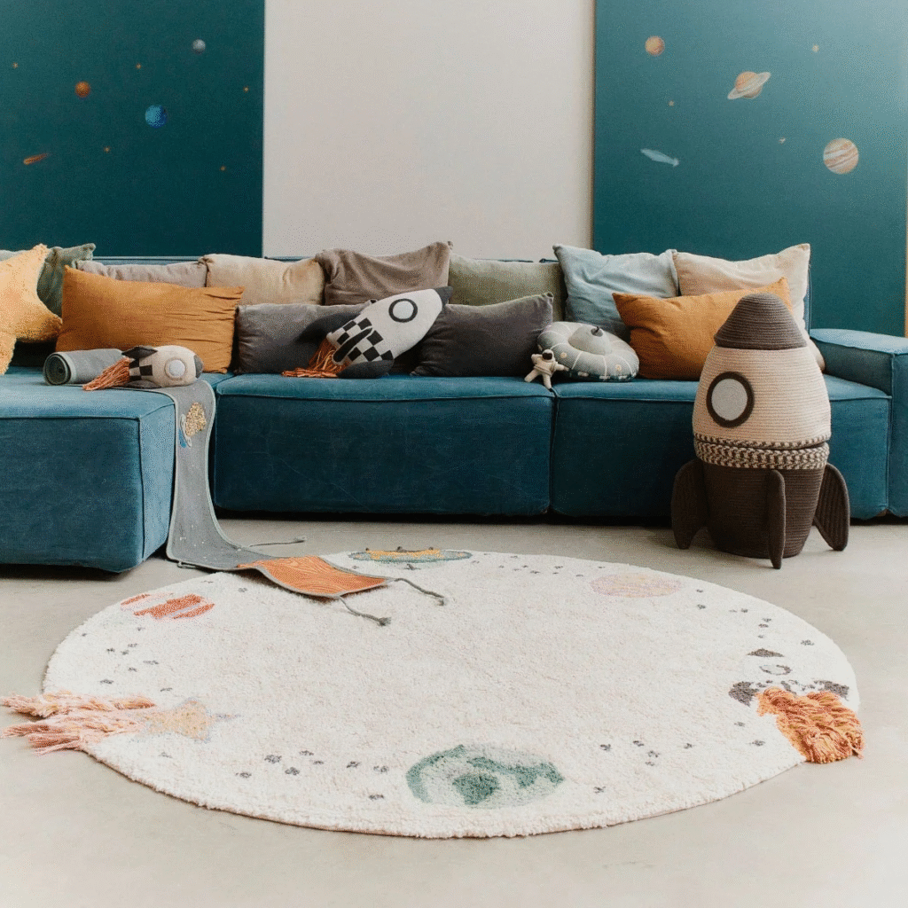 Além de funcional, o tapete ajuda a delimitar áreas dentro do quarto, como espaço de brincar ou de leitura.