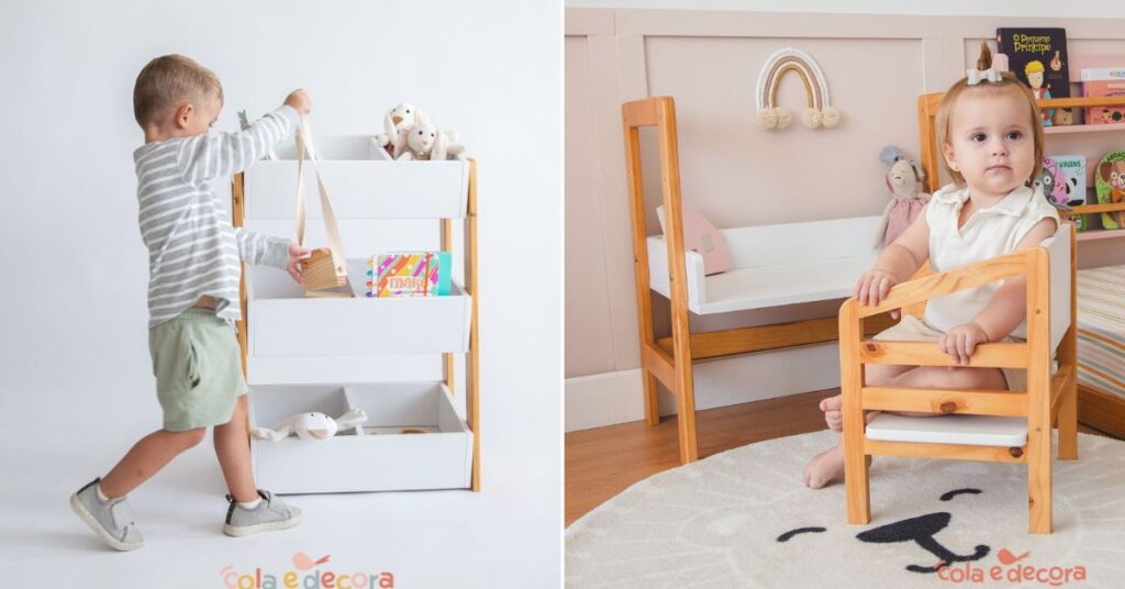Atualmente é possível mobiliar o quarto inteiro da criança com móveis adequados ao tamanho da criança, como estantes baixas e nichos organizadores que permitem que as crianças acessem seus brinquedos e livros, incentivando a organização e a autonomia desde cedo.